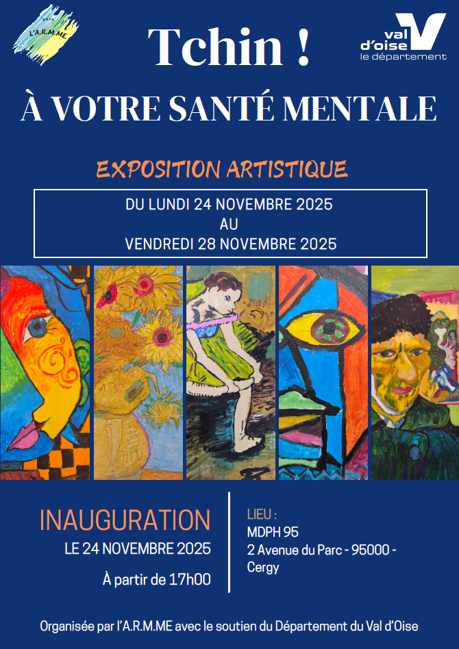 Du lundi 24 au vendredi 28 novembre 2025, la MDPH accueillera l'exposition artistique "Tchin ! A votre santé mentale !" organisée par l'association l'A.R.M.M.E.