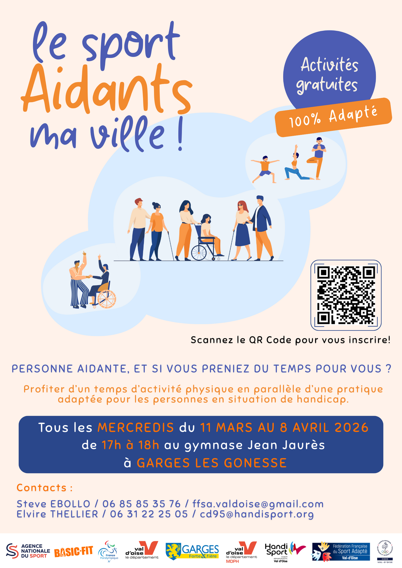| GARGES-LES-GONESSE | 11 mars 2026 18 mars 2026 25 mars 2026 1er avril 2026 8 avril 2026 | 17h - 18h | Salle multisports du complexe Jean Jaurès (20 Rue René Blouet 95140 Garges-lès-Gonesse) | >> S'inscrire |